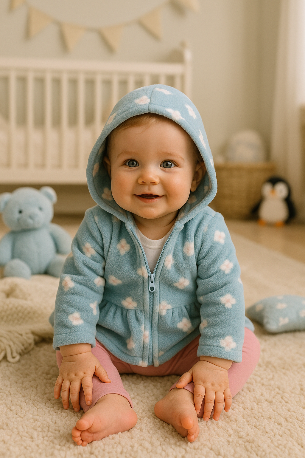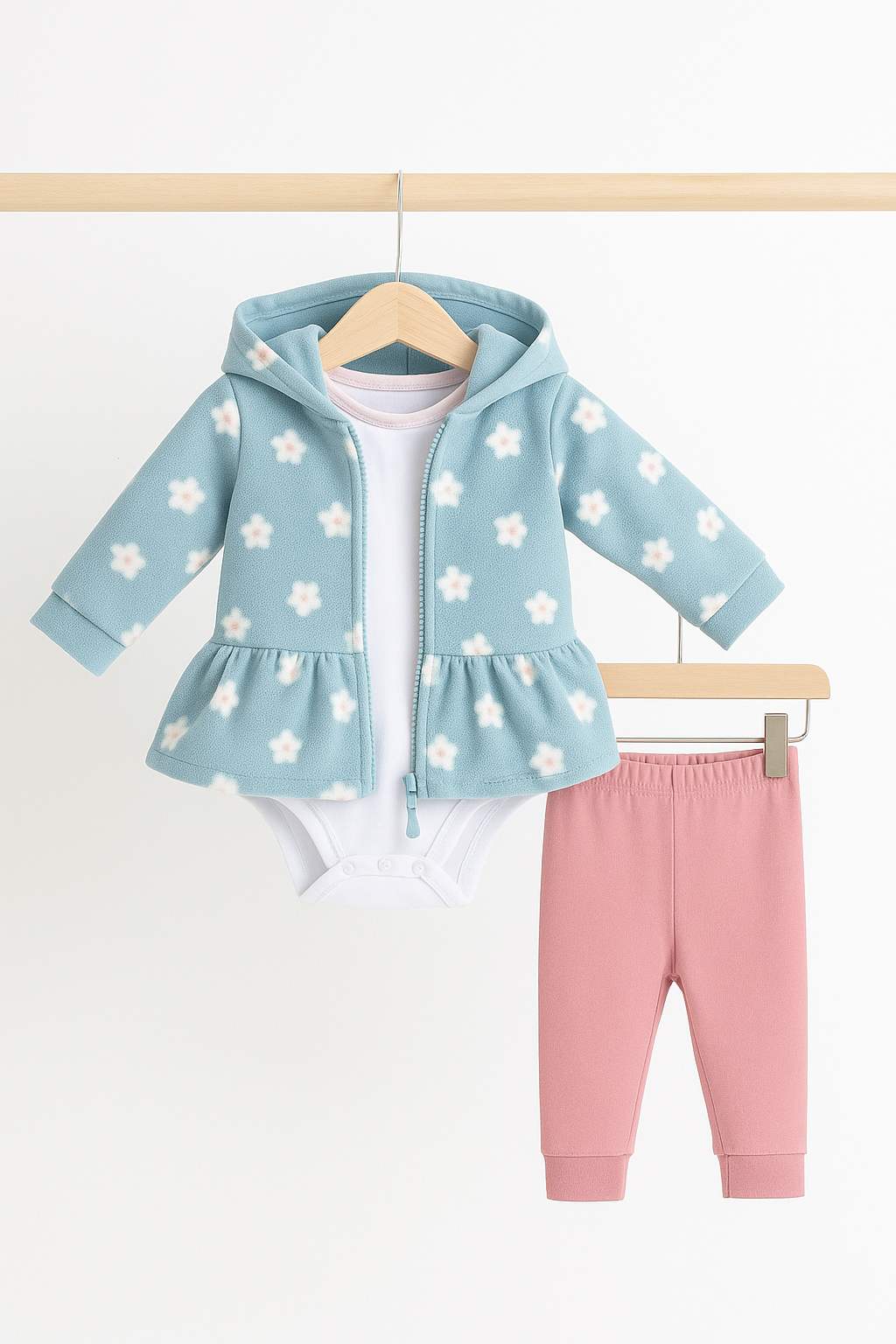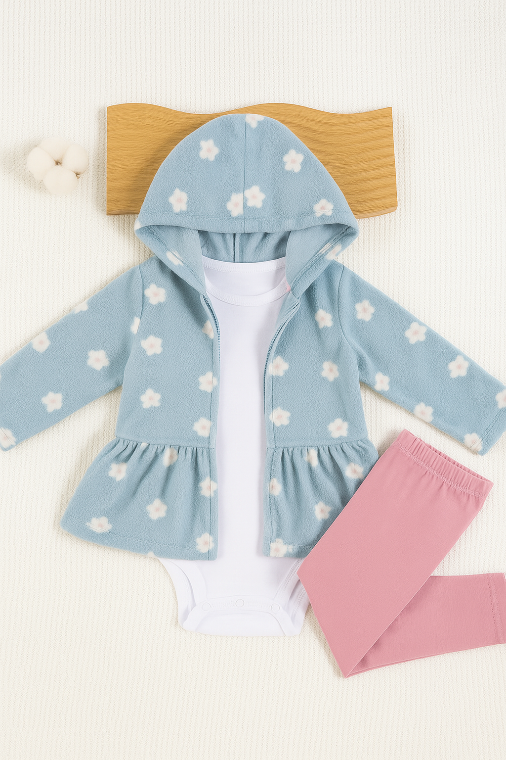 El saquito celeste con flores y volado en la cintura parece sacado de un cuento. La calza rosa suave acompaña con dulzura cada salto, mientras el body blanco completa este look listo para cualquier paseo, siesta o abrazo.