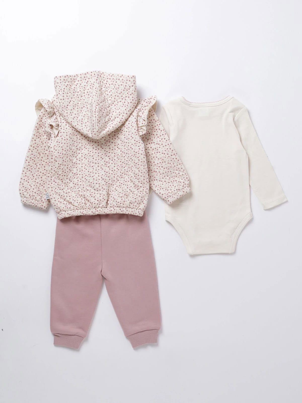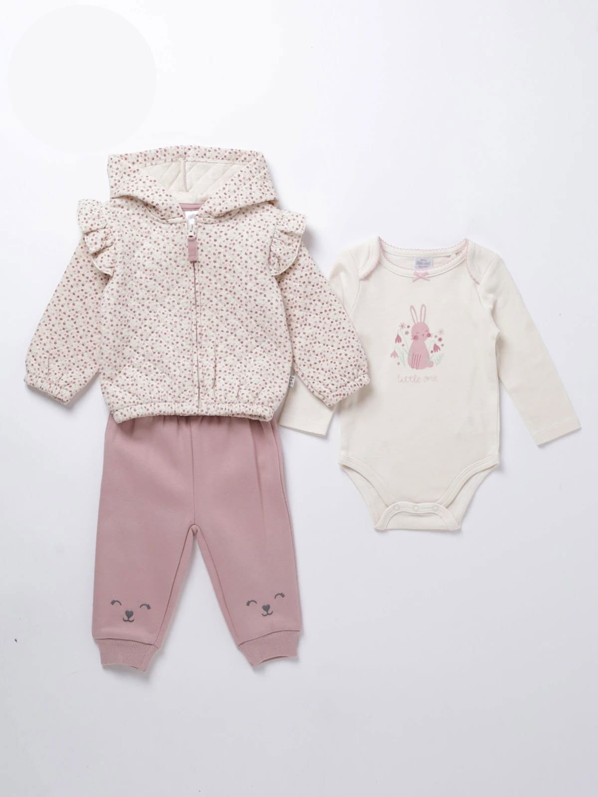 Conjunto de 3 piezas: campera con capucha y volados, body con conejita y pantalón con caritas
