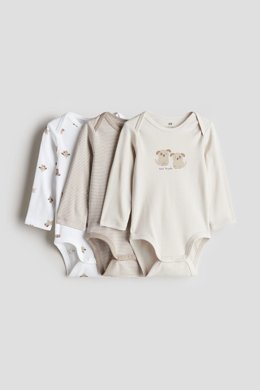 Estampa de perritos: uno con dibujo central "best friends", uno rayado y uno con patrón completo