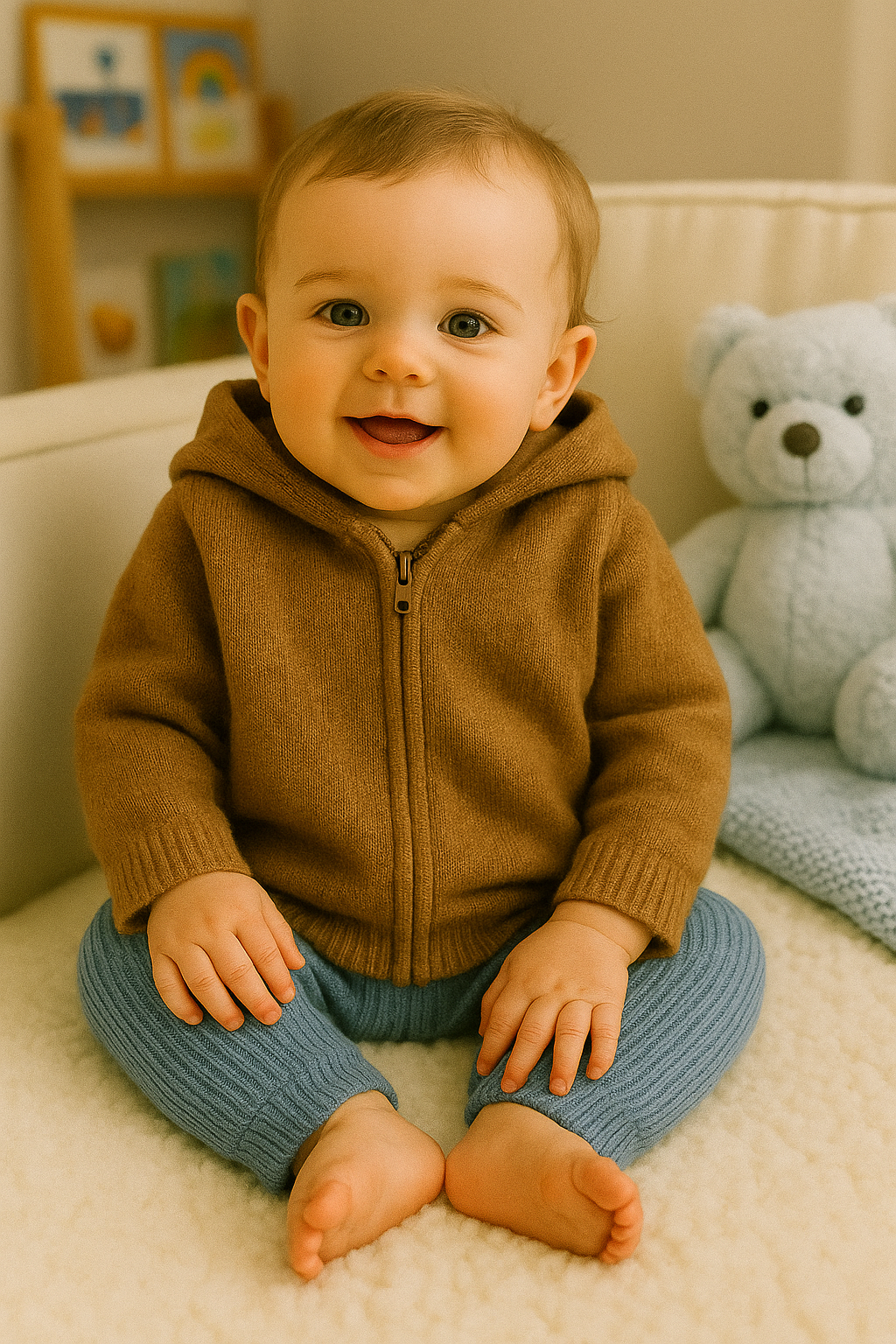 Este sweater color miel tostado, suave y livianito, es perfecto para esas tardes fresquitas donde todo se ralentiza: el juego, los pasos, el tiempo. Con su cierre al frente y capucha envolvente, acompaña los primeros paseos, las siestas en brazos y los días nublados que huelen a casa.