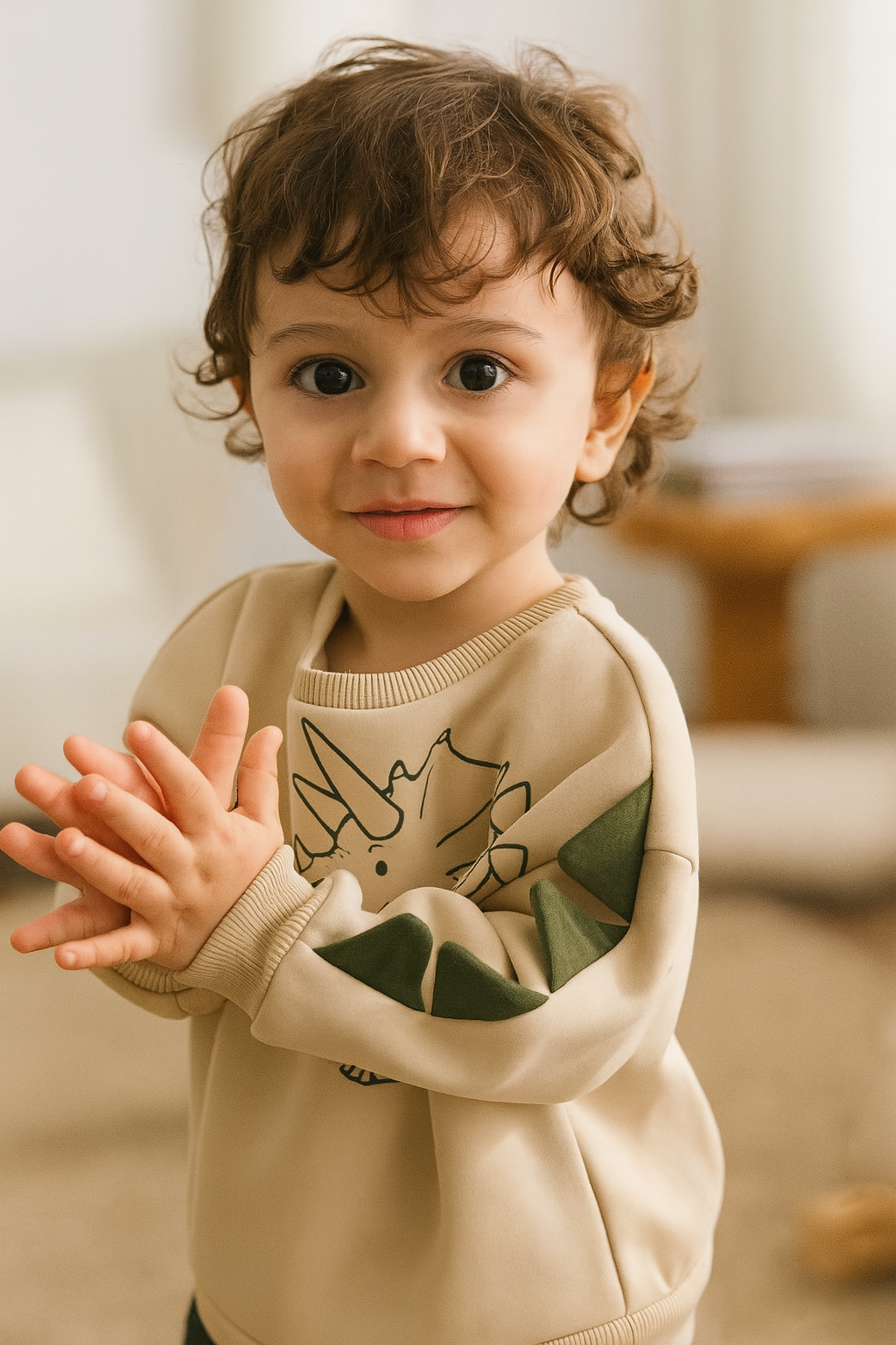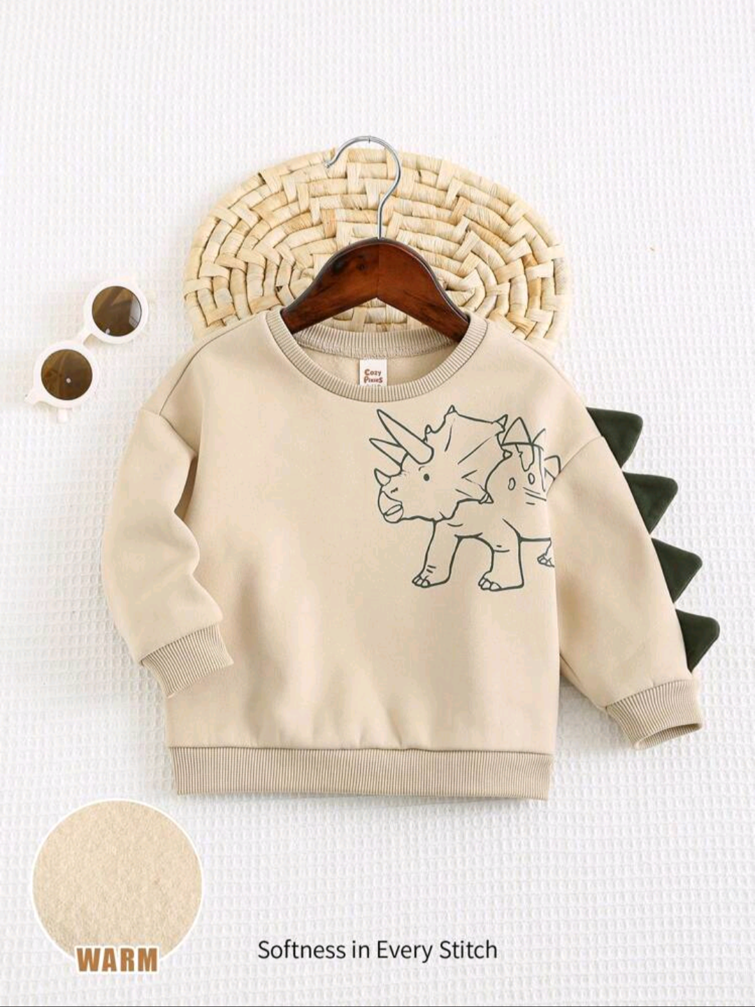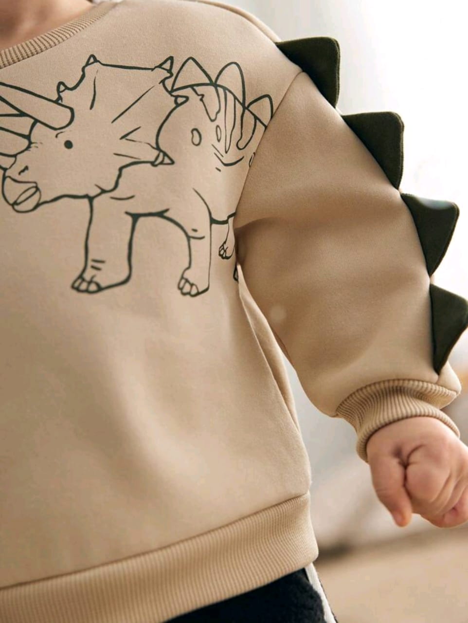 Como cuando los chicos se disfrazan sin querer, este bucito es más que abrigo: es aventura, ternura y juego. El triceratops estampado —con sus tres cuernitos amigables— parece estar listo para salir a explorar, y las púas suaves en la manga hacen que cada movimiento se sienta un poco más salvaje (pero siempre en modo mimoso).