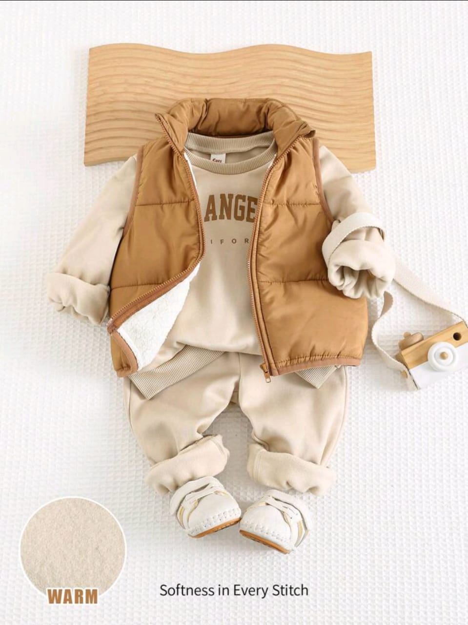 Con colores tierra que evocan la calidez del hogar y telas suaves que abrigan sin pesar, es el compañero perfecto para descubrir el mundo con ternura.