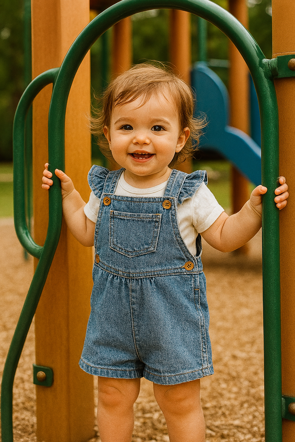 Este jardinero corto, con su denim suavecito y volados en los tirantes, fue pensado para esas aventuras chiquitas que quedan guardadas para siempre.