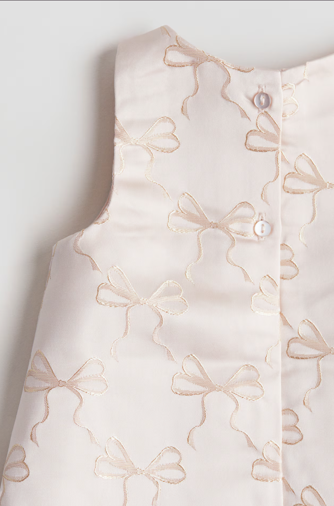 Este modelo, con su corte clásico y moñitos bordados, es como esos recuerdos de cumpleaños con globos, fotos en papel y torta casera.